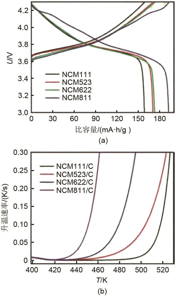 对高温环境引发的热失控进行仿真通常用烘箱模型,即在热滥用模型的基础上,设置传热场温度来模拟电池在高温环境下发生热失控。王青松等建立了磷酸铁锂电池的烘箱模型,得到6种不同温度下引发电池热失控时电池的温度变化(图1)。结果表明温度影响电池的热失控,高温可以使热失控发生得更加迅速和剧烈。黄文才等建立了方形锂电池三维分层烘箱模型,发现较高的对流传热系数和初始温度会使电池更快地进入热失控。但该模型中的电池层数较少,并未体现出实际电池卷绕的情况和热量在不同层之间的传播情况。赵磊和宁凡雨等利用热失控模型研究了NCM111、NCM523、NCM622、NCM811电池的0.1 C充放电曲线和温度-升温速率曲线(图2)。发现高Ni正极材料有助于电池储存更多能量,但加剧了电池的不稳定性,电池更易发生热失控且放热更加剧烈。但文献中建立的电池一维模型只能计算电池某一方向上的热行为,不具备空间表现能力,可以用来模拟圆柱电池轴向或径向的温度分布。
