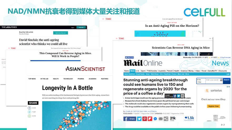 2013年,哈佛医学院教授大卫·辛克莱尔(David Sinclair)首次研究发现在哺乳动物中,通过口服NMN方式抗衰效果。此后至今,关于NMN的实验研究大幅增加。英国的《Daily Mail》(每日邮报)、美国著名科技期刊《Wired》、《Science》、《Nature》《Cell》等主流媒体都能看到NMN的身影。