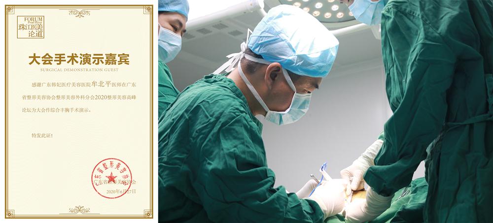 2020年6月27日,作为“珠江医美论道第2季·2020整形高峰论坛”大会选定的手术演示项目,广东韩妃牟北平院长惹火胸手术直播吸引到近百位公立医院整形医咖观摩,同时还有多家主流媒体进行现场采访和报道。广东韩妃整形外科技术院长牟北平亲自操刀,现场演示了惹火胸技术要点及技巧。