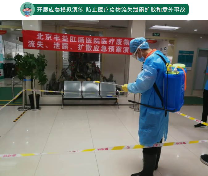 为进一步提高我院医疗废物院内意外泄露、流失、扩散后的防控应急处置能力,确保医疗废物在院内收集、运送过程的安全性,2020年7月30日下午,我院在一楼院内门诊大厅开展了医疗废物应急处置演练,院护理部总监张彩霞总监主持了本次演练,院长吴萍、医疗废物专职管理员、医疗废物收集员、保安、管理负责人等人参加了本次演练。