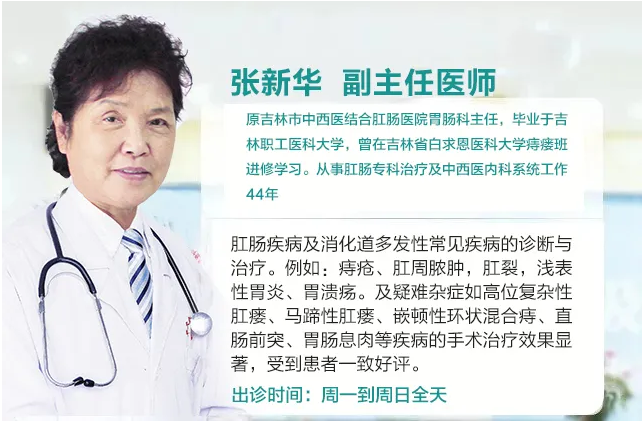 张新华 出诊时间:周一至周日著名女子肛肠、内科专家 副主任医师 临床经验44年 吉林市卫生局质量优秀医生获得者。