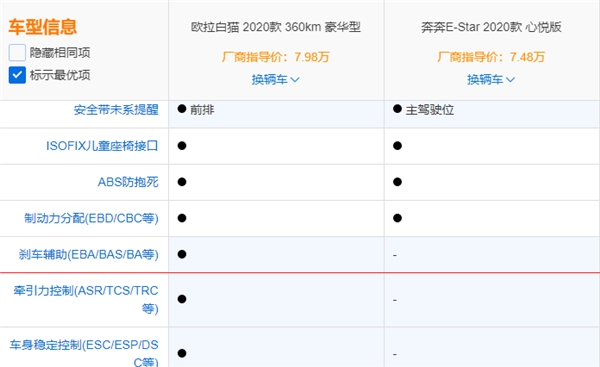 在这一环节,长安E-star的表现特没有太落后,同样也搭载了胎压监测、ABS防抱死等配置。不过有一点比较遗憾,其并没有搭载刹车辅助、牵引力控制和车身稳定控制等进一步保证行车安全的配置,与欧拉白猫相比少了些许诚意。