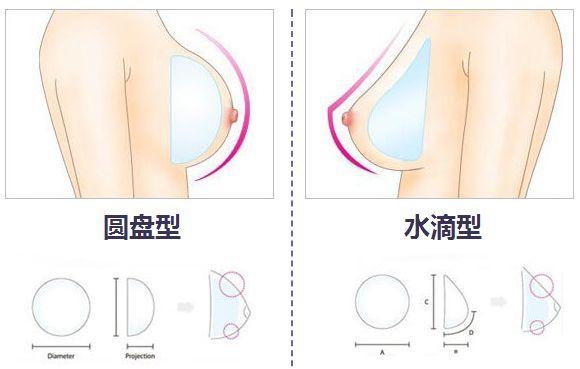水滴形假体胸部下集饱满于上集,胸部受自然重力影响,胸部凸点的位置落在胸部三分之一处,就像滴落的水珠一样,呈现自然弧度。因水滴形假体更符合人体形态设计,可以避免出现躺下后胸部下级出现边缘感的情况。就算平躺时也可以呈现饱满的形态。但水滴假体的非对称性结构强调了假体的精确置入,摆放角度的差异都可能导致胸部型态的差异,已致出现隆胸失败的结果。所以水滴型假体难度高于圆型假体,要求医生术前精确体表标记、术中的精确剥离和假体的精确放置。
