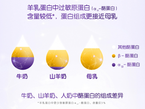很多妈妈会发现宝宝一喝牛奶就会吐奶、咳嗽或是起疹子。宝宝会这样是因为对牛奶中的αs1-酪蛋白比较敏感。这种过敏源蛋白含量占牛奶总蛋白含量的40%-50%,羊奶中过敏源蛋白含量仅占总蛋白含量的1%-3%。不论是体质敏感的宝宝还是普通宝宝,羊奶都是更合适的选择。目前市面上很多品牌都用牛乳清蛋白来代替物资稀少价格昂贵的羊乳清蛋白,这样就不是真正意义上的羊奶粉,合生元羊奶粉作为新一代羊奶,特添加100%纯羊乳清蛋白,更少的过敏源献给宝宝更纯净的爱。