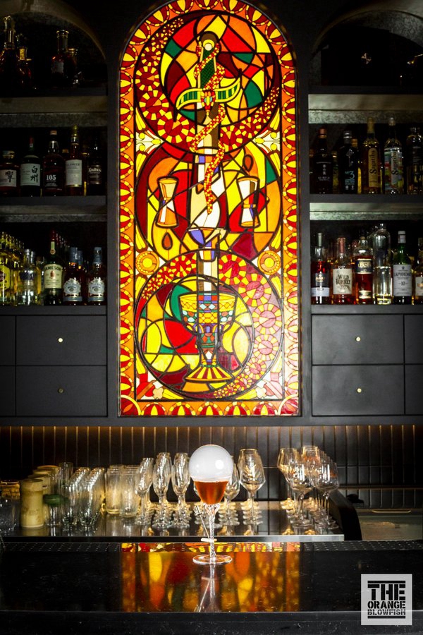 TBD专属饮酒仪式中的“四大元素”:酒杯、摇酒器、匕首、蛇被解构重组嵌入了彩绘玻璃。