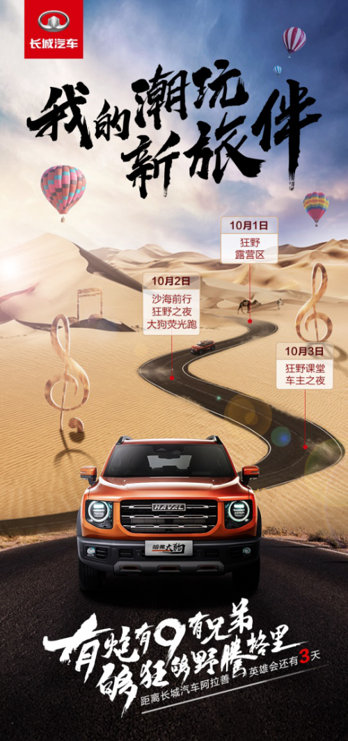 谁才会是长城汽车狂野公园最让人意想不到的存在?必须是哈弗大狗!自上市以来,就备受瞩目,既能城市潮玩,又能个性越野,哈弗大狗助力潮玩年轻人随性切换潮流场景。定位为“我的潮玩新旅伴”,哈弗大狗这次带领年轻人们开启沙漠场景,10月2日晚“大狗荧光跑”将成为整个阿拉善英雄会最“亮”的夜跑。
