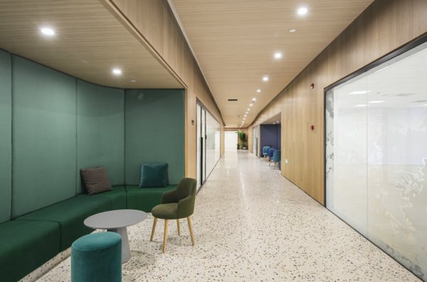 内部空间的设计通过局部扩大与转折的巧思,达到共享空间的目的,为办公空间带来一定隐私与社交上所需的公共氛围。此外,“前社-黄浦”订制办公楼少见的大露台,将室外葱郁绿意引入室内视线所达之处,对于纾缓紧张的办公压力带有积极的安抚作用。