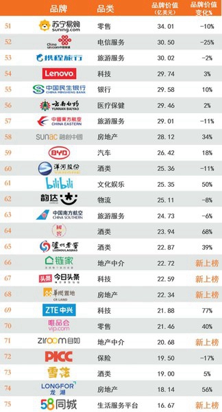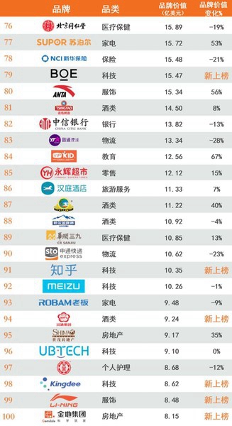 今年,有来自八个类别的16个品牌新上榜,其中五家来自科技品类,以短视频品牌抖音(第14位;169亿美元)和电子商务团购平台拼多多(第23位;95亿美元)为首。在新上榜的品牌中有五个独角兽公司(公司市值超过10亿美元的公司):视频分享应用抖音(第14位;169亿美元)和快手(第25位;86亿美元),房地产经纪自如(第71位;21亿美元),科技品牌今日头条(第67位;23亿美元)和知乎(第91位;10亿美元)。运动品牌李宁(第99位;8.48亿美元)继2013年首次上榜后,今年重新上榜。李宁顺应高涨的爱国主义热情推出了一系列庆祝中国文化和设计的产品,传递了国家自豪感,成功地提升了对年轻人群的吸引力。