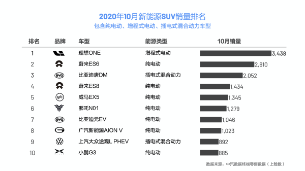 双11快结束了,估计各电商平台正在紧锣密鼓地统计销售额,并期望能狠狠秀友商一脸。而在此之前,不妨让我们先来看看10月份汽车圈的销量。11月10日,中汽数据终端零售数据,也就是上险数新鲜出炉。从下图可以看到,在10月份的新能源SUV销量排名中,理想ONE以3438辆的上险数稳居第一,和第二名蔚来ES6直接拉开828辆的差距。