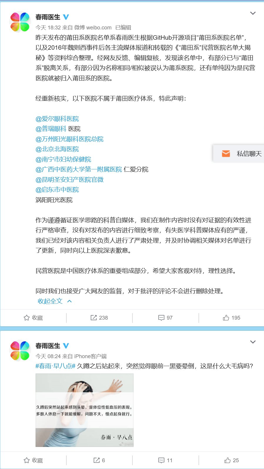 所幸的是,3月14日18:32,“春雨医生”微博文章纠正了这一错误: