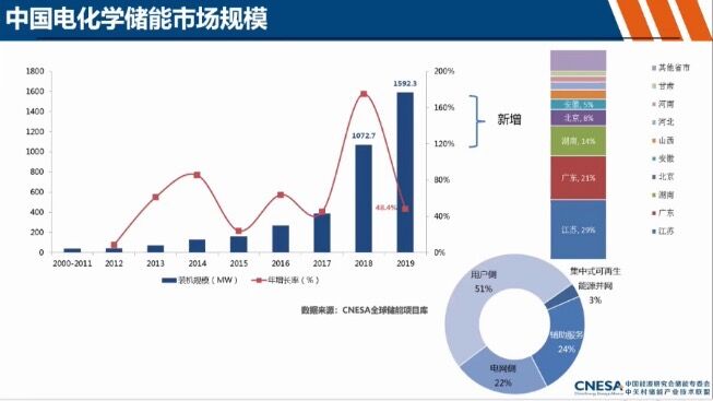 截至2019年底,中国已投运储能项目累计装机规模为32.2GW,占全球18%,同比增长3.2%。其中最大份额是抽水蓄能、为93.7%,抽水蓄能的占比在持续下降。电化学储能累计装机规模为1592.3MW,占比4.9%,比去年同期增长了1.5%。2019年新增储能装机大概520MW,年增长率是48.4%。忽略2018年相对激增的数据,整个储能产业仍在稳步增长的轨道上。