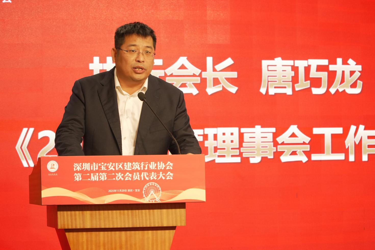 执行会长唐巧龙代表协会第二届理事会向大会汇报了2025年度工作情况及2026年度工作要点。报告指出,考虑到当前建筑行业复杂多变的市场环境及协会自身情况,协会主动作为,2025年累计为会员企业减免会费27万余元。协会充分发挥社会组织资源优势,助力宝安区精准对接帮扶地区乡村振兴、支持教育发展等公益事业,全年累计捐款47万元。协会积极融入区“三调联动”工作体系,成功化解行业内矛盾纠纷16起,为当事人节省了大量诉讼成本和时间。委派60余名入库专家配合相关职能部门开展施工现场安全质量检查工作,为会员企业提供技术咨询、方案论证、风险防控等多元化专业服务。同时,积极为会员企业排忧解难,解决其生产经营过程中遇到的诸多实际问题。接下来,协会将在引导会员企业扎实做好安全生产和文明施工的前提下,在全面优化资源配置、引领企业走专业化发展道路等方面开拓创新,为行业发展积极建言献策,推动协会工作持续蓬勃发展。