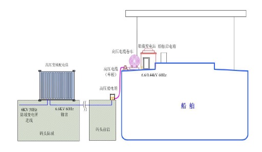 船舶靠港期间,停止使用船舶上的发电机,而改用陆地电源供电。港口提供岸电的功率应能保证满足船舶停泊后所必需的全部电力设施用电需求,主要包括生产设备(如舱口盖驱动装置、压载水泵等)、生活设施、安全设备以及其它设备。港口(提供岸电)和靠港船舶(接受岸电)各自专门带有一套岸电系统。