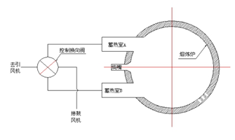 如图 2 所示,当常温空气经过蓄热室(蓄热室 AB 内装高铝耐火球)A 时,蓄热室 A 内的耐火球的热量传给了空气,使空气达到 1100℃以上的高温,经过风口 A 返回给炉膛助燃;燃烧产物(烟气)经过风口 B 进入蓄热室 B 将热量传给蓄热室 B 内的耐火球。换向后风口 B 返回热空气给炉膛助燃,风口 A 排烟气给蓄热室 A 的耐火球蓄热。AB 风口进入热空气、排出热烟气反复更换,耐火球放热、蓄热也伴随变化,助燃风进入炉膛温度始终保持在 1000-1100℃(比炉温低 80~150℃)以上。按国内公认的加热炉节能理论,助燃风每提高 100℃节能约 5%。在蓄热系统按上述交替方法工作的同时,燃料燃烧系统按照未进行蓄热式改造前的原有方式正常工作,向大气的排烟温度低于 150℃。